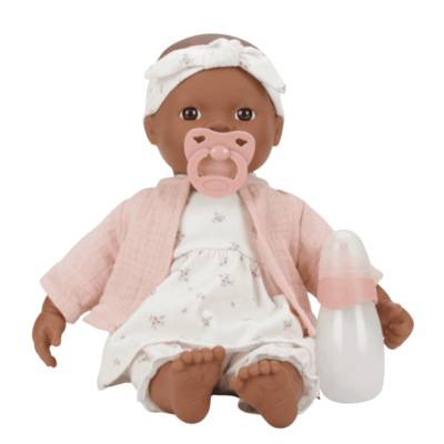 Children love to mimic everything their parents do, and this baby doll will inspire your little one to engage in nurturing and caregiving role-play. Noa is dressed in a hairband, dress and pants in the White Meadows design, with a soft pink waistcoat. Changing her clothes promotes fine motor skills, and the pacifier and milk bottle add an element of interactive play.