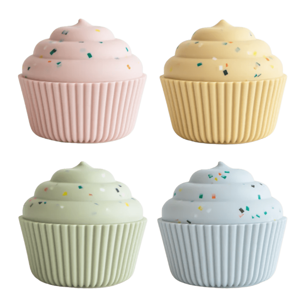 Add a pinch of sweetness to playtime with our mix and match silicone cupcakes. Made in four delicious shades, littles can practice color matching or get creative and cook up their own combinations. The sprinkled frosting top and squeezable silicone base easily separate and reattach to help develop fine motor skills and hand-eye coordination. With small draining holes on the bottom for easy cleaning, these cupcakes are a charming addition to play kitchens, tea time, or bath time.